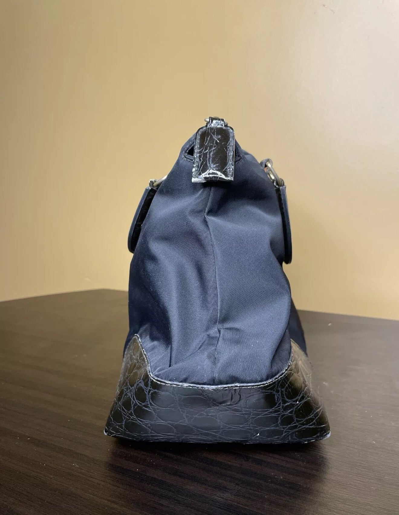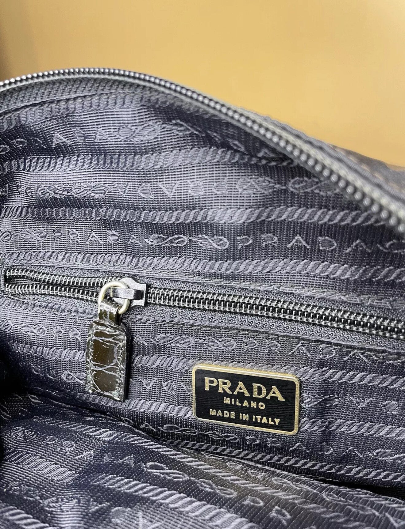 What a beautiful contrasts of texture! The smooth touch of nylon next to the roughness of leather, this stunning Prada shoulder bag will elevate any casual outfit</p><br /><p>. The bag features a solid pattern and a zip closure, with black leather handles and a shoulder strap for comfortable carrying. The medium-sized bag has a depth of 5 inches and is made of high-quality nylon and leather, with silver hardware accents and a classic theme. </p><br /><p>The interior of the bag is lined with black leather and features zipper accents for added sophistication. This elegant bag is perfect for any occasion and is sure to turn heads. The bag is made in Italy and is not vintage or personalized. Don't miss out on the chance to add this beautiful Prada shoulder bag to your collection